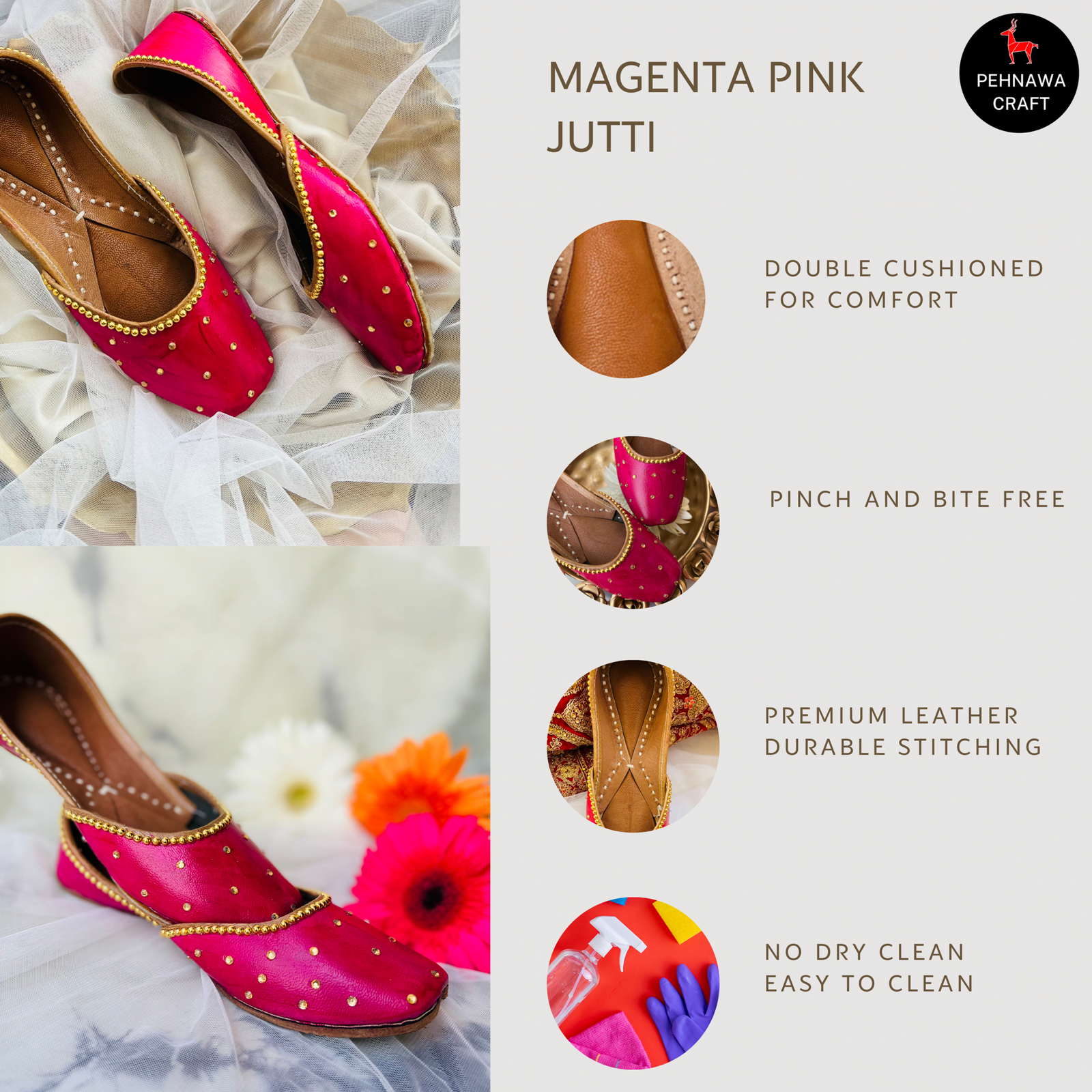 • BITE & PINCH FREE – Experience the ultimate comfort with our PehnawaCraft Embellished Soft Premium Leather Hand painted Juttis