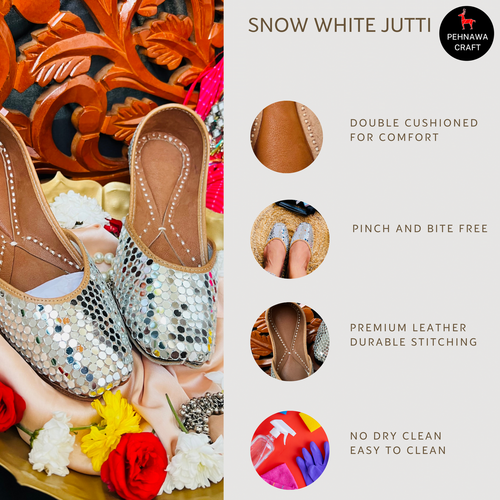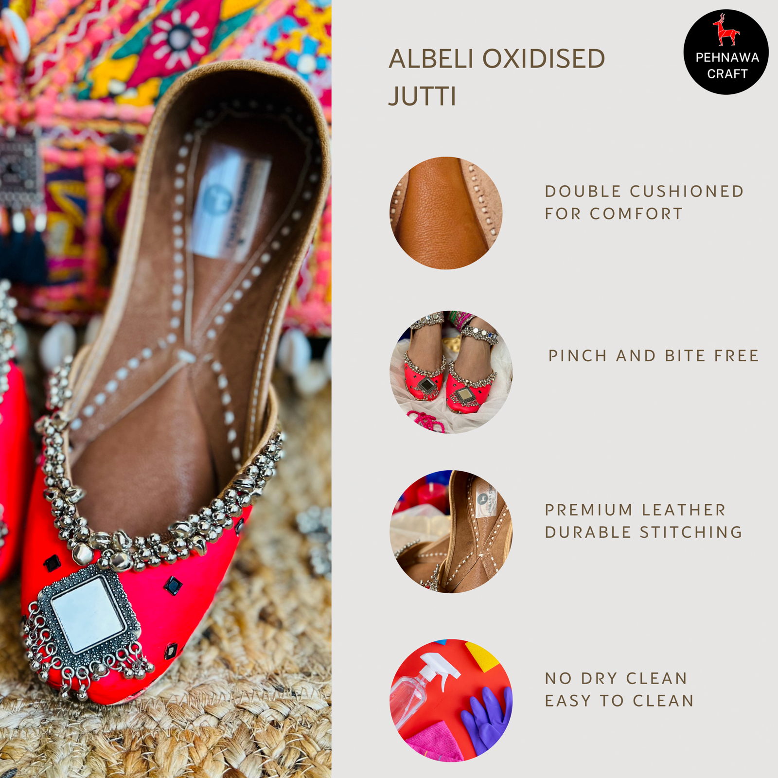 - Since they are all handcrafted slight inconsistencies might be visible sometimes, which makes these juttis unique and adds charm to the product.